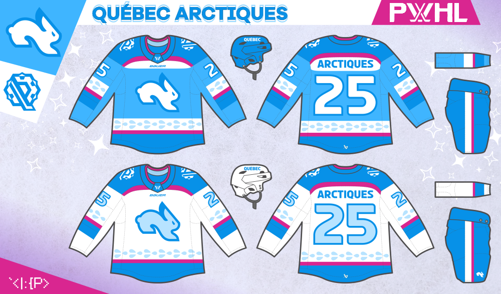 The idea was to create a Nordiques tribute without preventing that team from returning in the future as well. We have an Arctic hare primary mark, as well as a Citadelle/snowflake secondary. The jersey's hare tracks replace fleurs-de-lys.