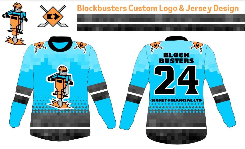 This design was created for a youth hockey team that wanted a Roblox-themed design along with the name "Blockbusters."